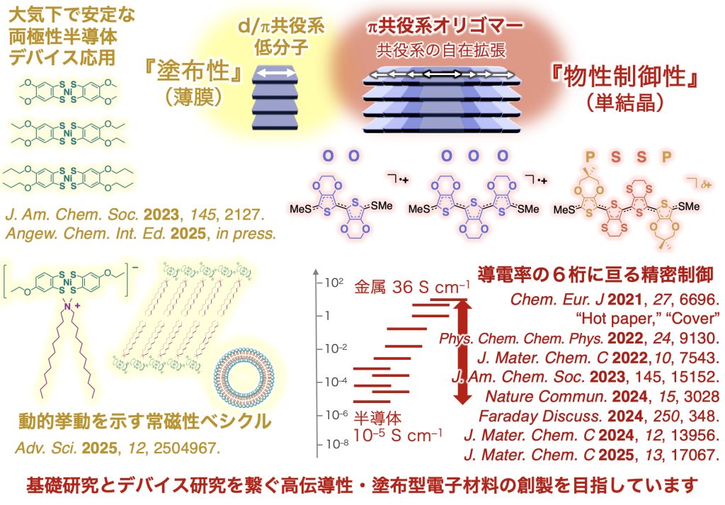 独自の分子設計技術で、電気伝導自在制御、塗布型導体・半導体材料など画期的な機能を示す次世代エレクトロニクスを革新する分子性電子材料を創製し、基礎研究と実用デバイス研究をつなぐ。